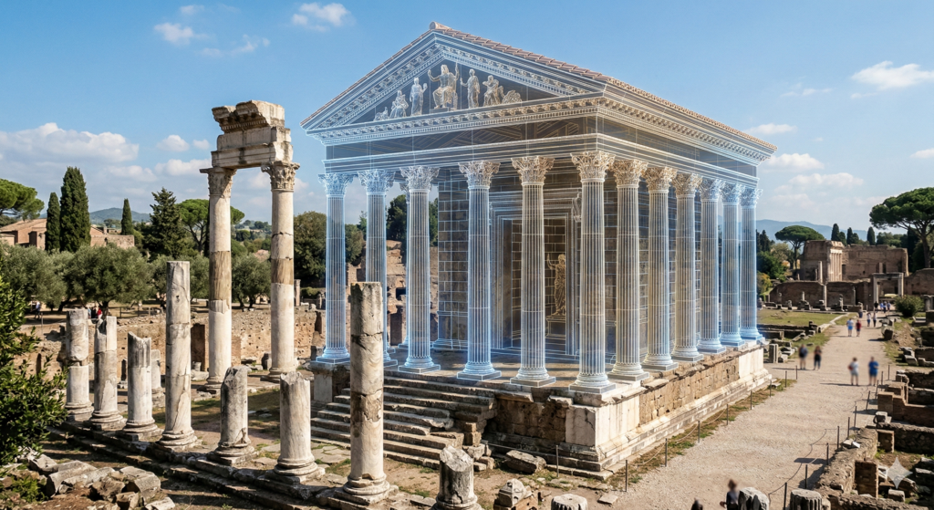 Sé testigo de reconstrucciones instantáneas en realidad aumentada mientras recorres las ruinas en el mundo real.